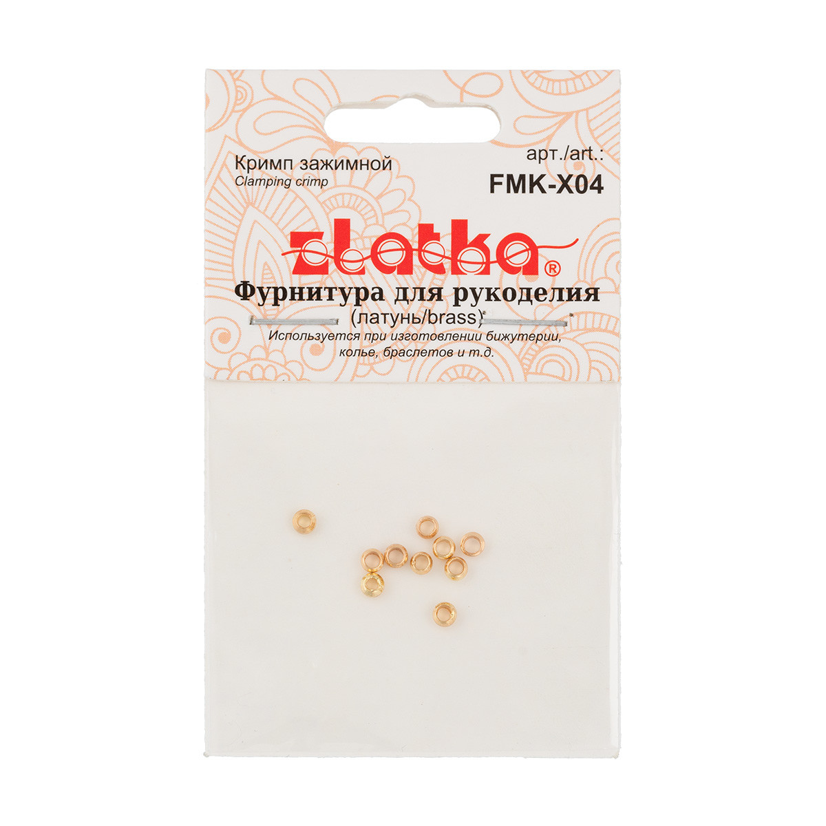 Кримп зажимной " Zlatka" FMK- X04 - это вспомогательный элемент фурнитуры, с помощью которого можно маскировать узелки на леске, ювелирном тросике, фиксировать бусины, если невозможно создать узел на леске или ювелирном тросике, кримп используют для закрепления. Также кримпы используются просто в качестве маленьких бусин. Размер: 2. 5 х 2. 5 мм. Количество в упаковке: 10 шт. Материал: латунь. Сообщить о неточности в описании